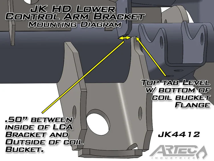 Notes : IF USING FACTORY CONTROL ARMS, YOU MAY NEED TO GRIND OFF A SMALL AMOUNT OF THE METAL BELOW THE BUSHING TO CLEAR THE SKID PLATE ON THE BRACKET. This bracket requires welding to the axle and removal of the factory bracket. Welding should be done by a competent welder and Artec Industries is not liable for incorrect installation or improper welding.